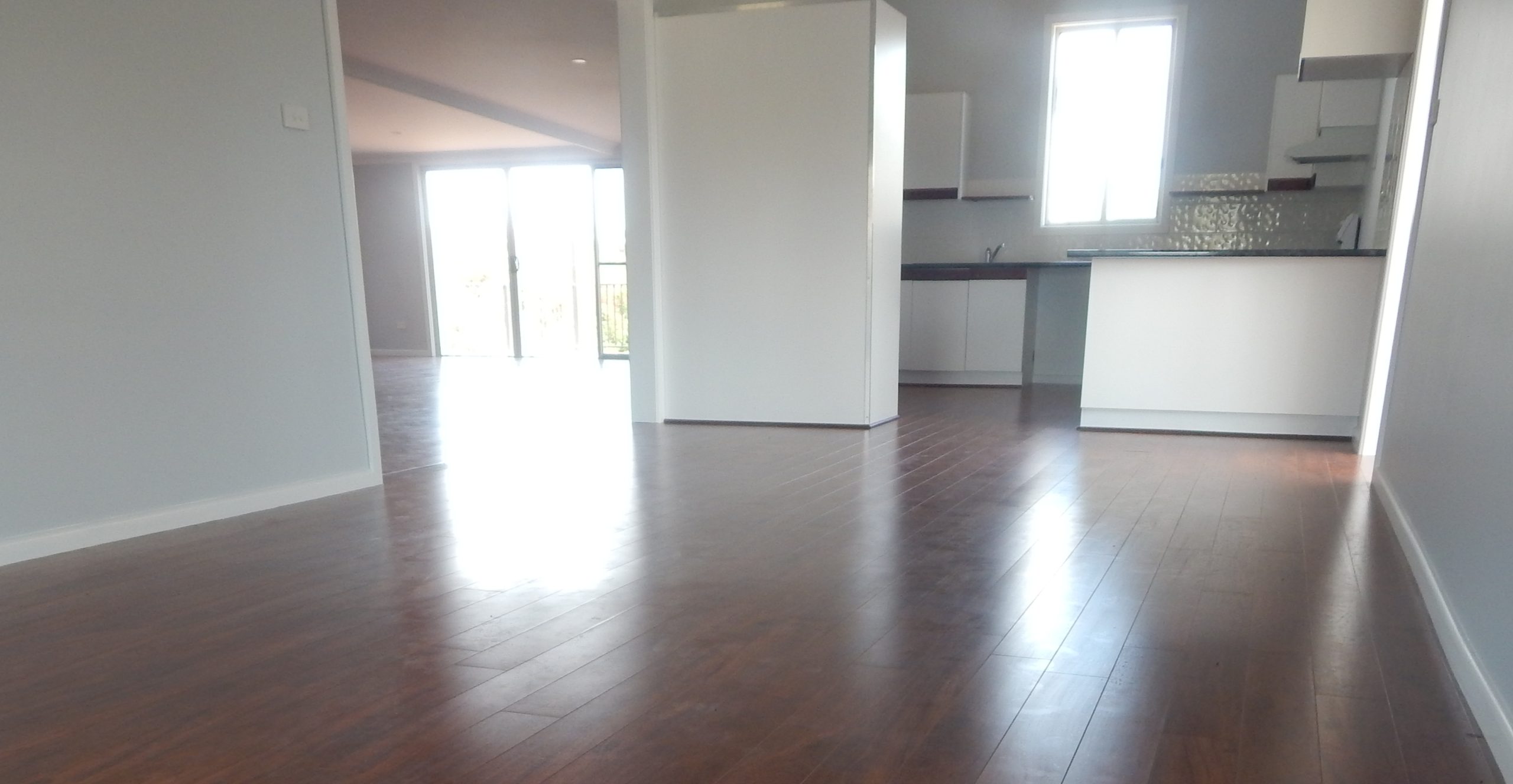 The elevated, four-bedroom residence features a large merbau timber deck with a western outlook and an equally large, covered veranda facing Kamilaroi Drive.