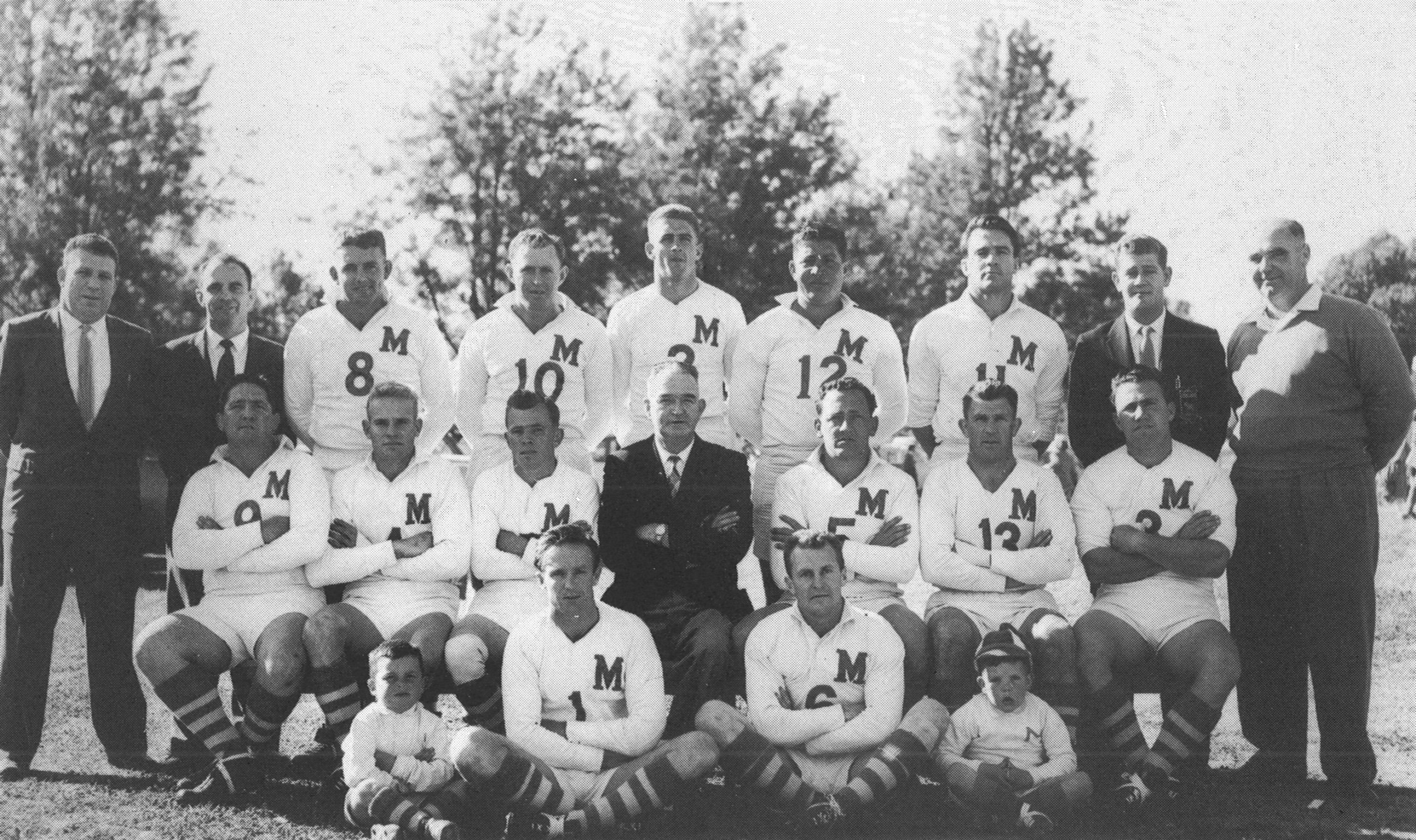 Moree Rugby League Football Club in 1960 (back row from left) selector Keith Jarvis, co-coach Clive Churchill, Reg Mitchell, Don Cameron, Harold Broderick, Ross Jenkins, Arthur Henderson, Rodney O’Mullane, selector Bob Picone with (seated from left), Allan Johnson, Heinz Blume, Rodney Skaines, club president Noel Tolhurst, team captain and co-coach Eric Gilligan, Alf Hardman and Ivan Shearer. Sitting at centre in front are Max Scott (left) and Kevin Bourke, flanked by team mascots Michael Clarke (left) and Phil Hardman (Image Supplied). Clive Churchill returned the following year to captain-coach Moree.