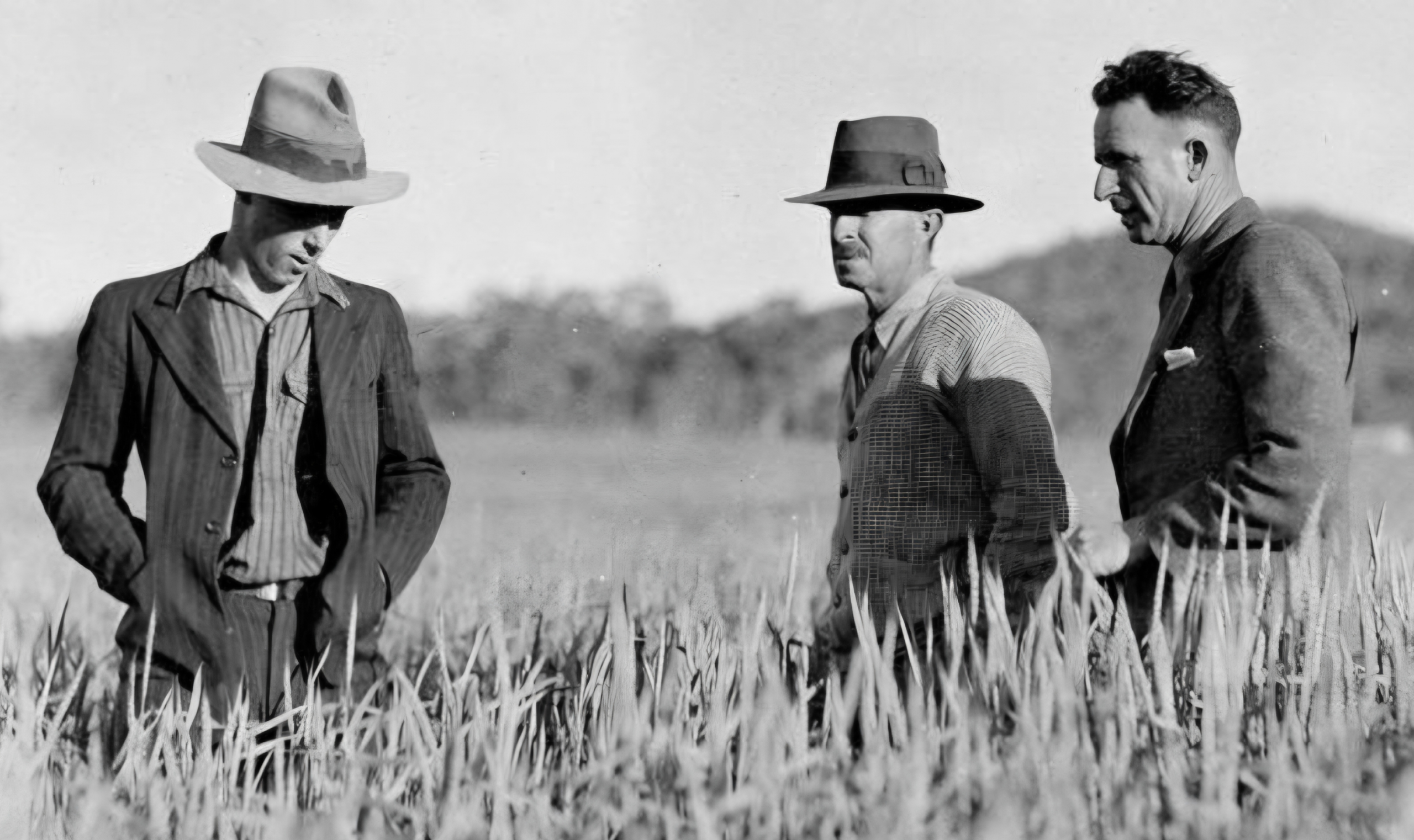 (from left) Bruce Beeson, Charlie Beeson and Jim O’Reilly inspecting a crop on Leyburn, 20 kilometres west of Gunnedah, in about 1938 (Image: Beeson family collection).