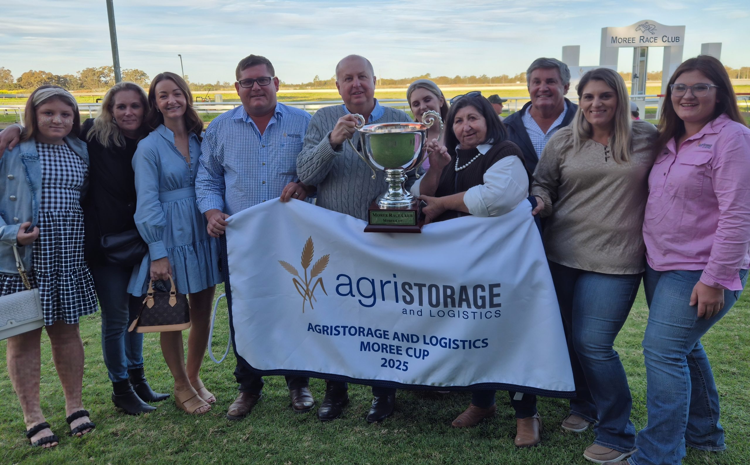 Proud owners Jenny Steepe and Kel Penfold holding the Agri Storage and Logistics Moree Cup with race sponsors after winning Moree Race Club’s signature race in August.