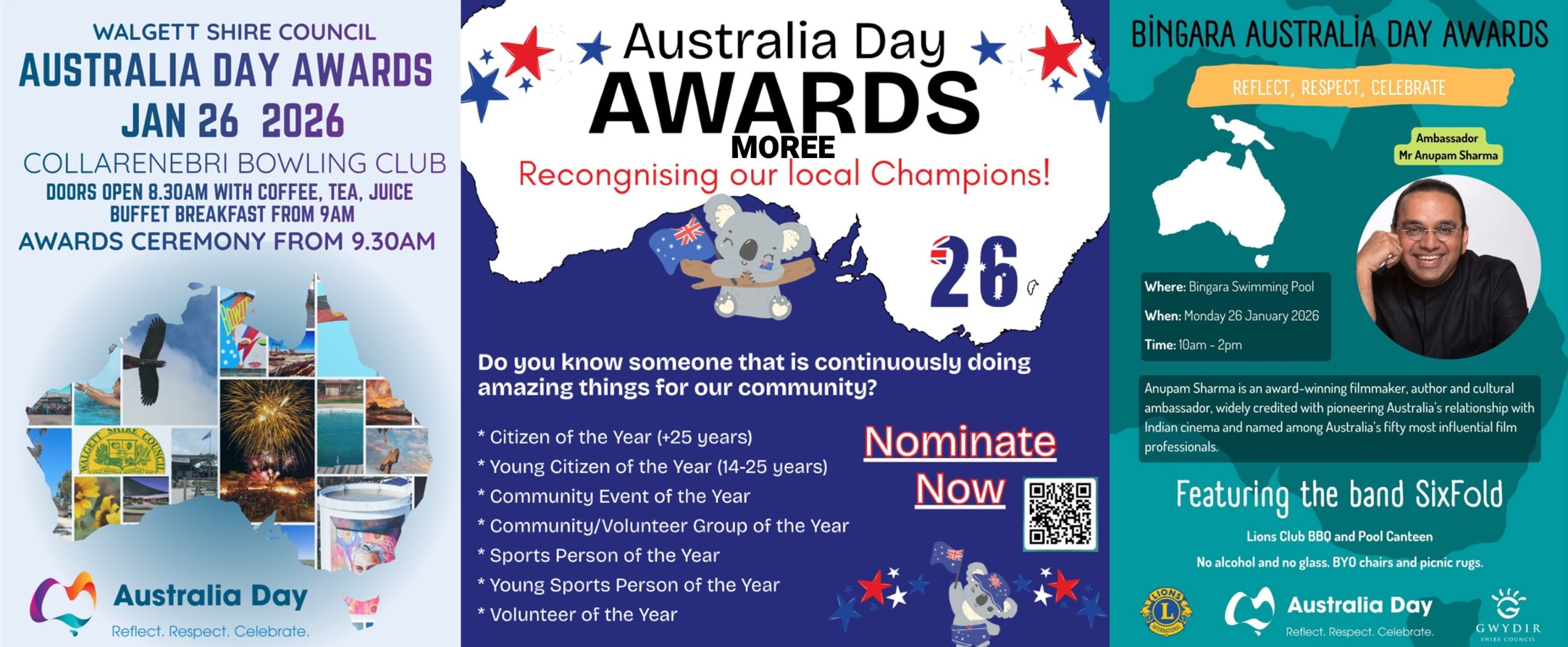At Bingara, Australia Day celebrations will be held between 10am and 2pm at Bingara Swimming Pool, featuring live entertainment by SixFold as well as a Lions Club barbecue and pool canteen.