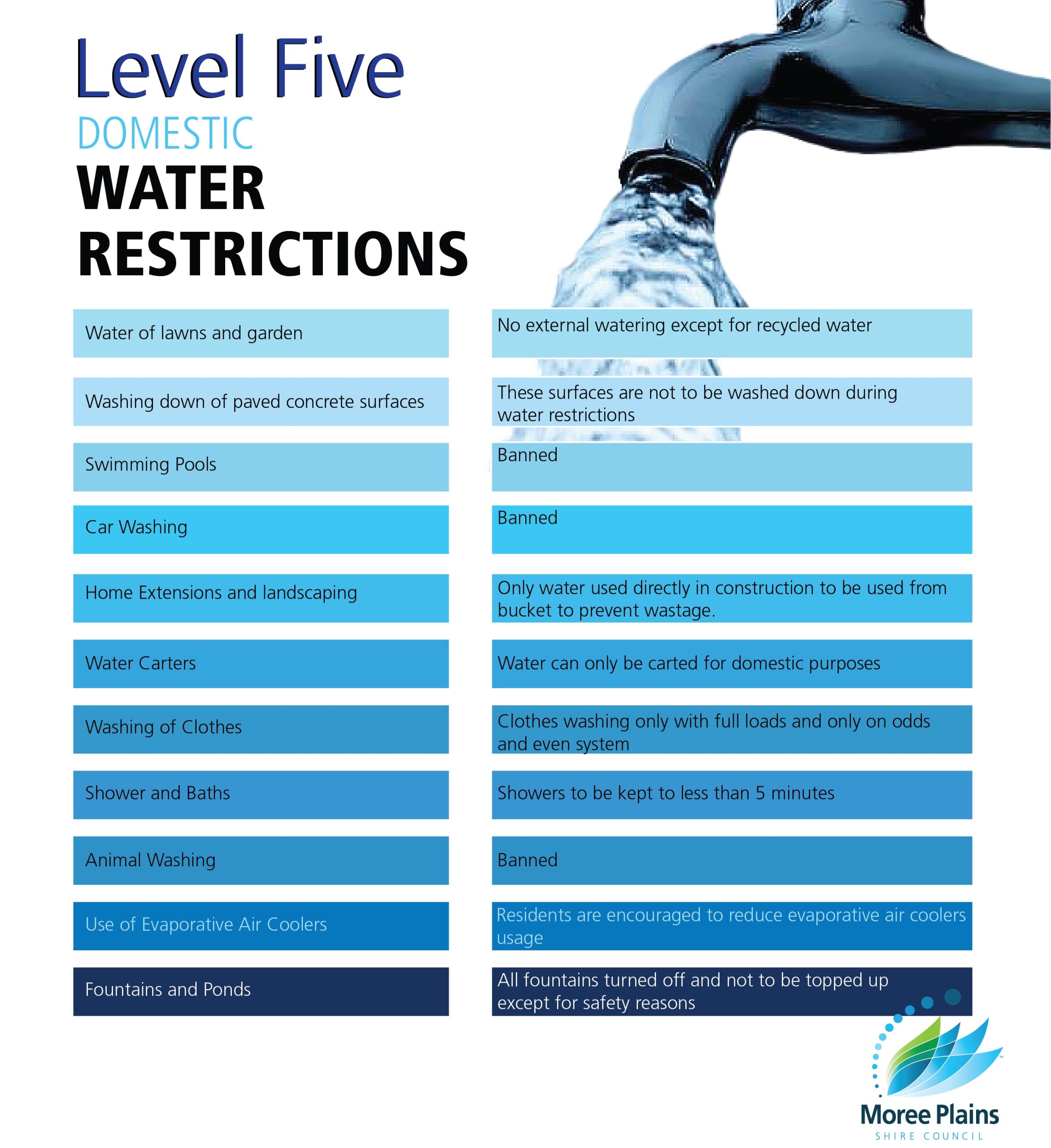 Level 5 Restrictions for Moree – Only essential household water usage is permitted