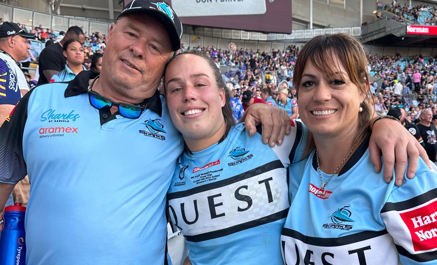 Proud parents Danny and Katreana Byers with Rhiannon at the 2024 NRLW grand-final (Image Supplied).