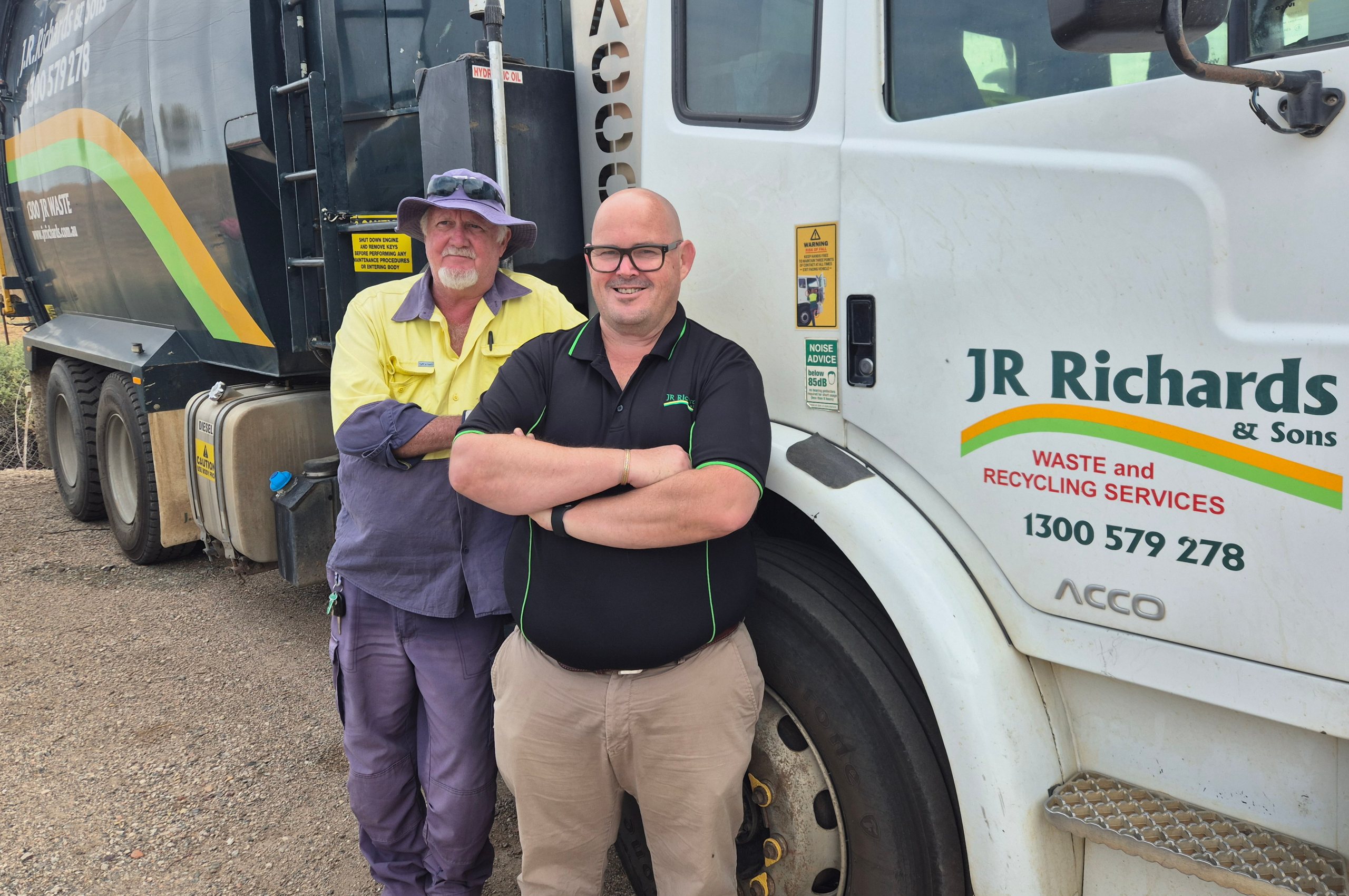 (at front) JR Richards Moree operations manager, Mark Adams, with driver Greg Stevens at Moree Waste Facility.