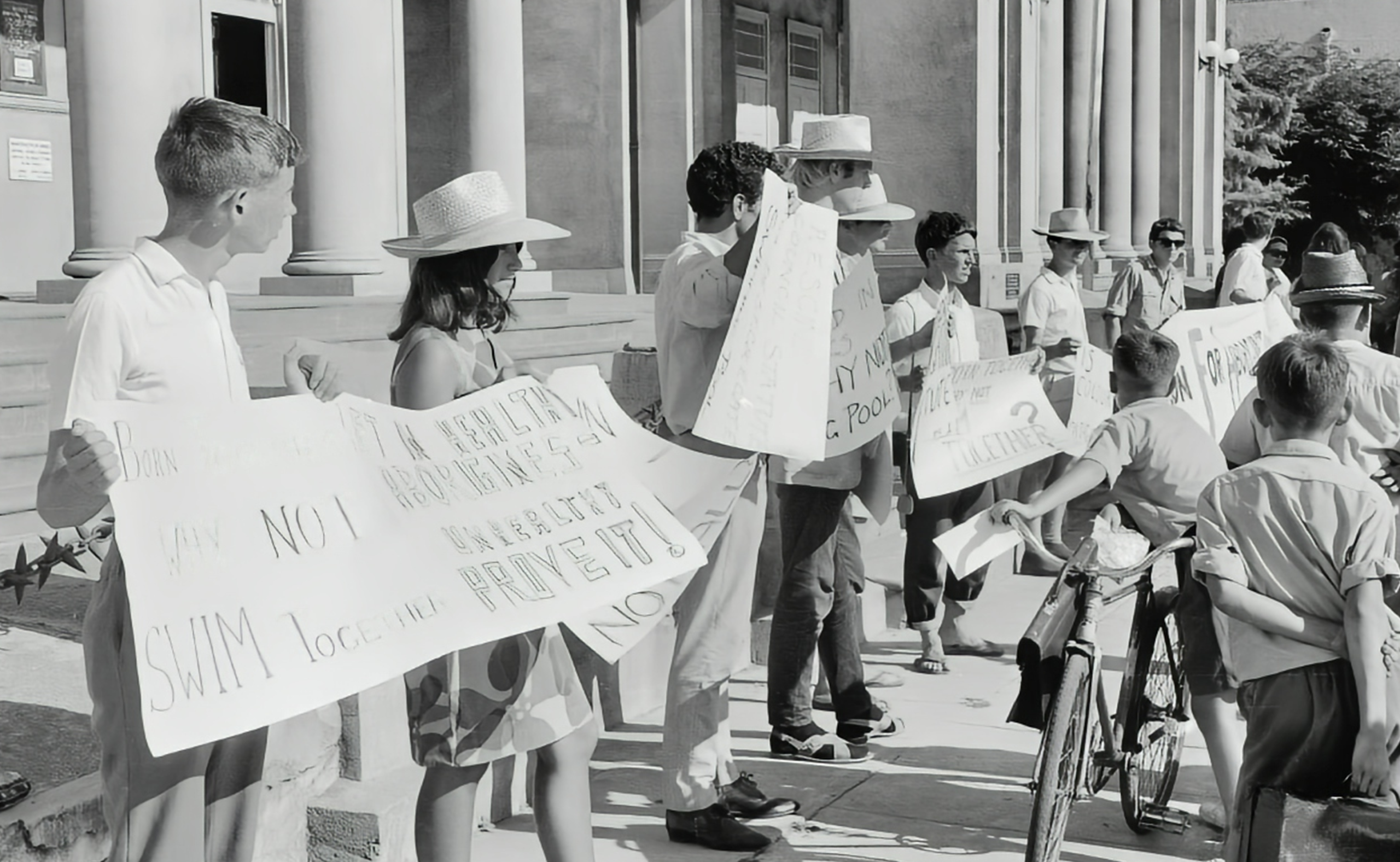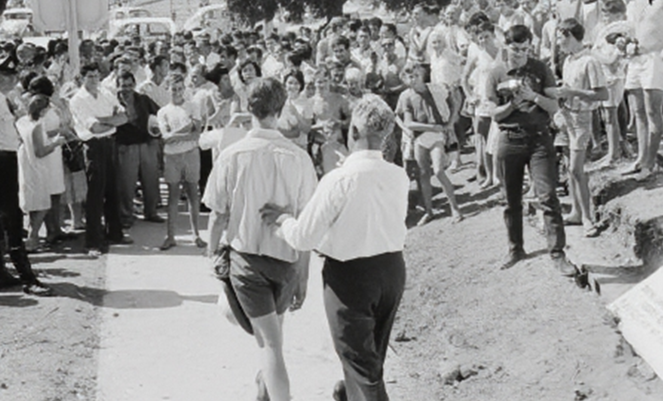 Moree mayor Bill Lloyd escorts a university student from Moree Bore Baths in 1965 during the Freedom Ride (Image courtesy of Mitchell Library, State Library of New South Wales).