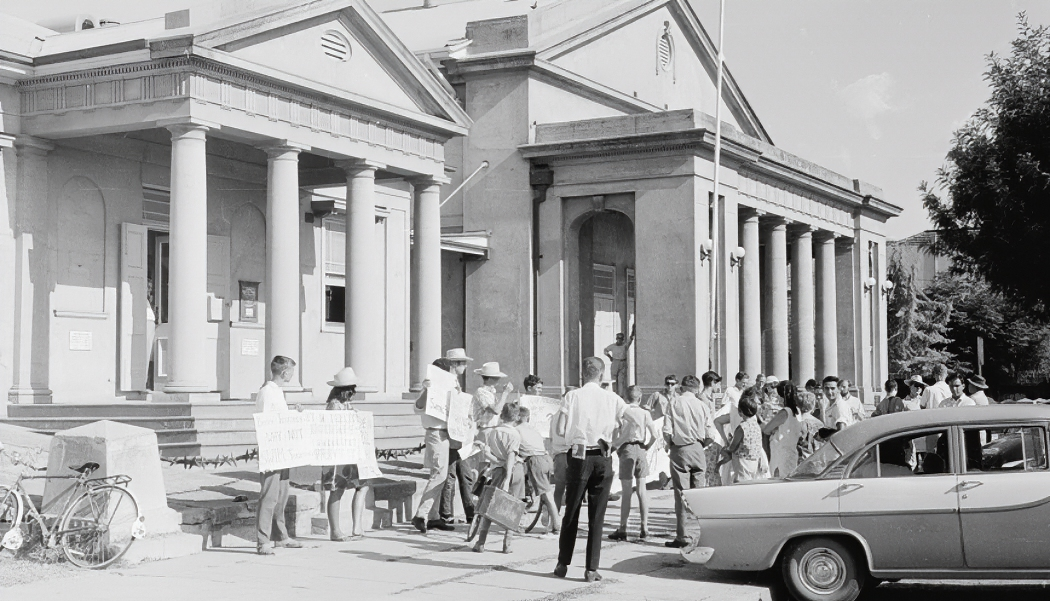 Protesters at Moree War Memorial Hall during the 1965 Freedom Ride (Image courtesy of Mitchell Library, State Library of New South Wales).