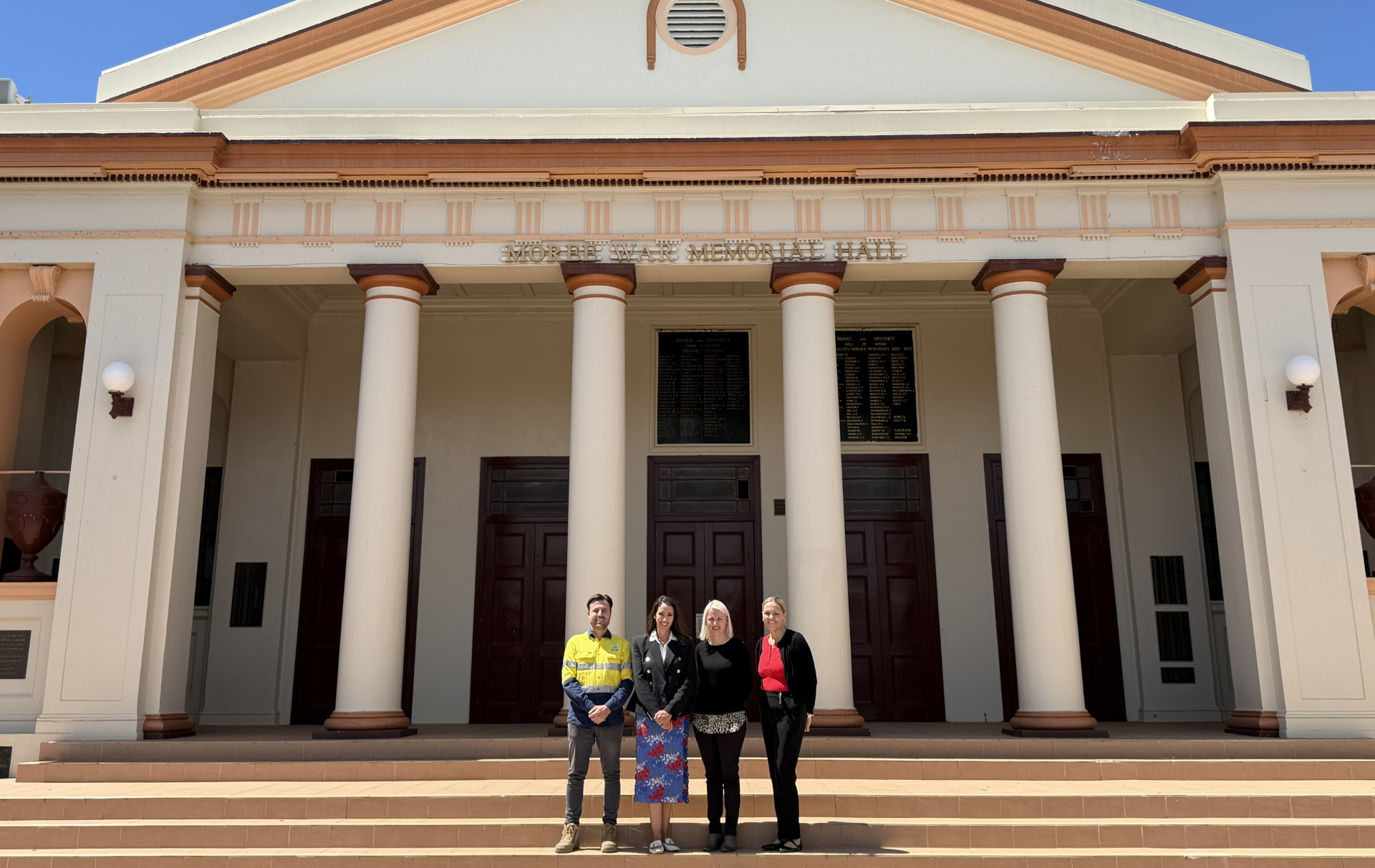 (from left) project manager Todd Jones, Moree Plains mayor Susannah Pearse, general manager Natalia Cowley and events manager Rachel Cubis on the steps of Moree War Memorial Hall.