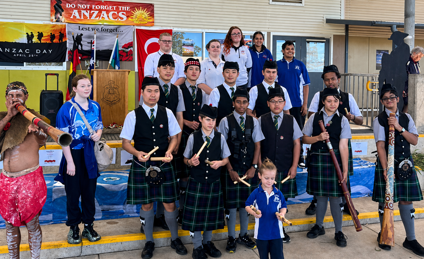 Students from both schools were joined by the local community on Anzac Day, along with Aboriginal Elders, to pay their respects at the dawn service, followed by a march down Wilson Street, again accompanied by the bagpipe band.